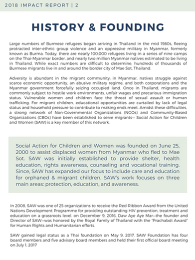 Onsite, we gained a better understanding of our long term partner’s strengths and challenges while working closely with SAW’s administrators to determine how to best utilize our skills given the community's context. Collectively, we determined that consolidating SAW’s data from 2018 to create an annual report to portray their recent financial crisis to the English speaking world would have the greatest impact on fundraising efforts. I worked as the photographer & editor on the report.